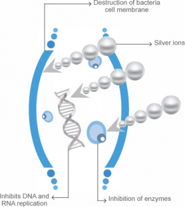 Silver ions are highly active, penetrating bacterial membranes rapidly. They interact with the enzymes and other proteins in bacteria, causing cellular disruption and loss of stability. Silver ions also interact with the bacterial cell wall and bind to the bacteria’s DNA and RNA, preventing the bacteria from replicating.